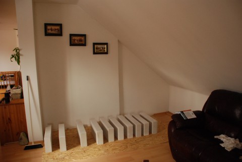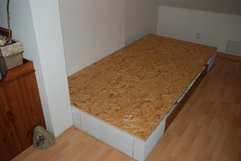 Základ jsme vytvořili z tenké OSB desky, ytongu a navrh přišla silnější OSB deska, uprostřed šuplík na uskladnění věcí: