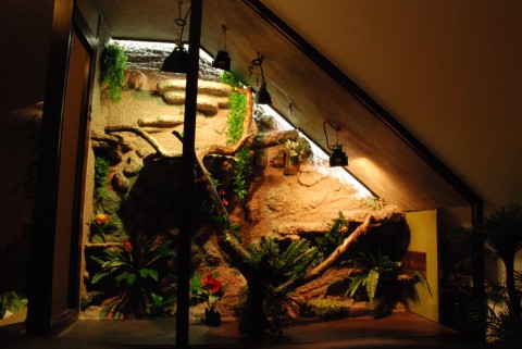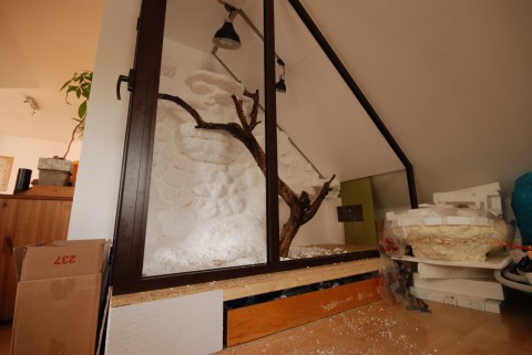 Zde je výsledek již s hotovým komplet osvětlením a pozadím. Na dno jsem nakonec položil obyčejné lino aby nebyl problém s úklidem. Snad to vydrží nápor ostrých drápů leguána.